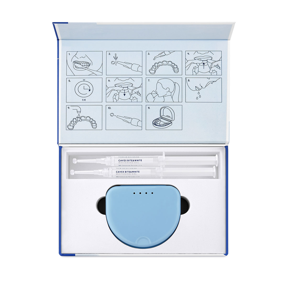 Das Cavex Bite&White Patienten-Kit war das erste Bleaching-Produkt, das Cavex entwickelte. Dieses professionelle Bleaching- Set für zu Hause ist benutzerfreundlich und ermöglicht ein beeindruckendes Bleaching-Ergebnis im Handumdrehen. Vor der Verwendung des Cavex Patientenkits muß eine Bleachingschiene angefertigt werden damit das thixotrope Gel sich gleichmäßig auf den Zähnen verteilt .
